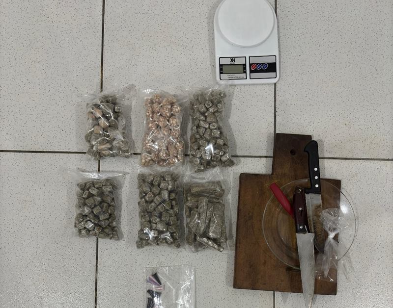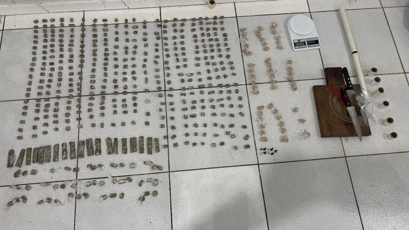 No local, foram apreendidos aproximadamente 230g de crack, 430g de maconha, 19 tabletes da mesma substância, nove “pinos” de cocaína, além de objetos utilizados para a prática de tráfico de drogas.