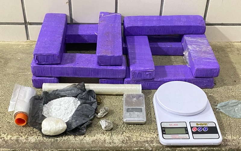 Ao chegarem ao local, os policiais avistaram os indivíduos, que evadiram-se e deixaram para trás uma bolsa contendo 11 barras de maconha, totalizando 8.220 gramas, além de 154 gramas de cocaína e 02 balanças de precisão.
