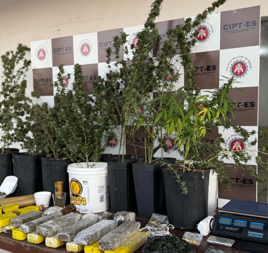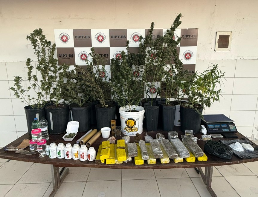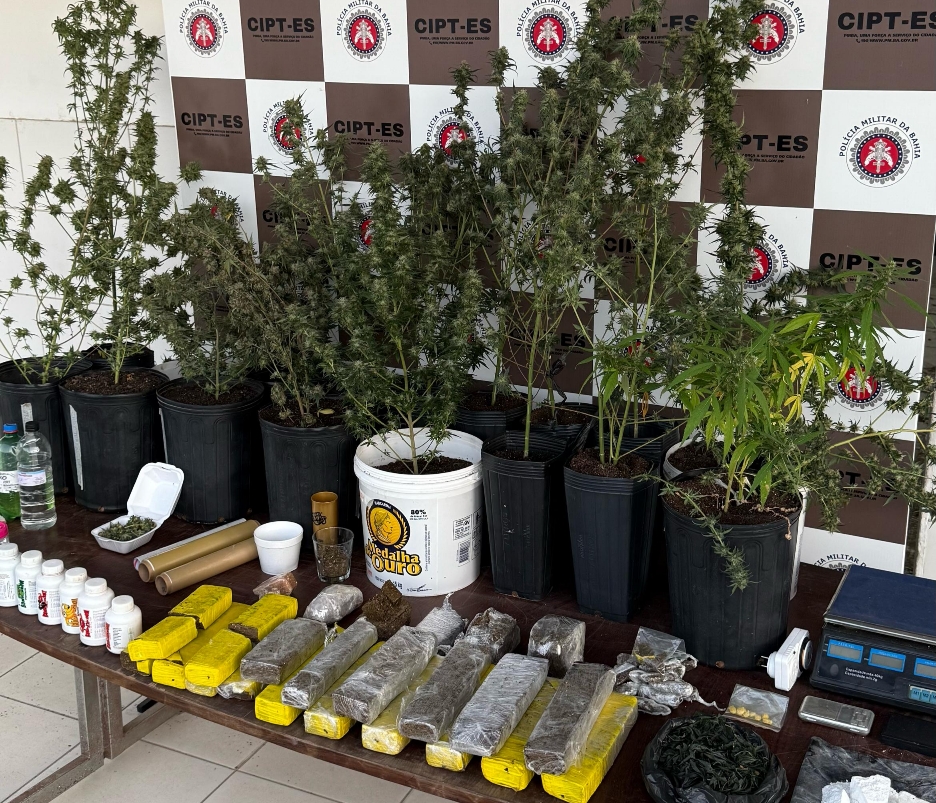 Na sequência, os agentes iniciaram buscas no veículo, onde encontraram porções de maconha escondidas embaixo do banco do carona. Dentro da residência, foram identificados diversos tabletes de maconha espalhados pelo chão e na parte dos fundos do imóvel, onde também havia pés da planta e materiais para cultivo.