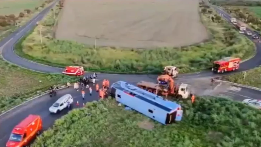 Onze pessoas morreram após um ônibus de turismo tombar na MG-223. A polícia informou que oito corpos já foram identificados.