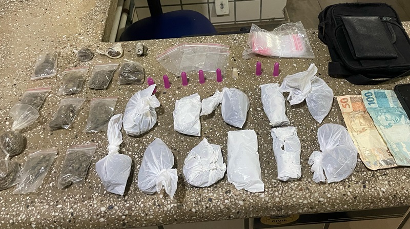 Durante a abordagem e revista pessoal, foram encontrados com o suspeito os seguintes materiais: 25 buchas de maconha (350g), R$150,00 em espécie (sendo uma nota de R$100 e uma de R$50), 1 pino de cocaína (2g), 1 celular Xiaomi Redmi Note 13, 1 bolsa, 1 carteira e 1 documento de identidade (RG).